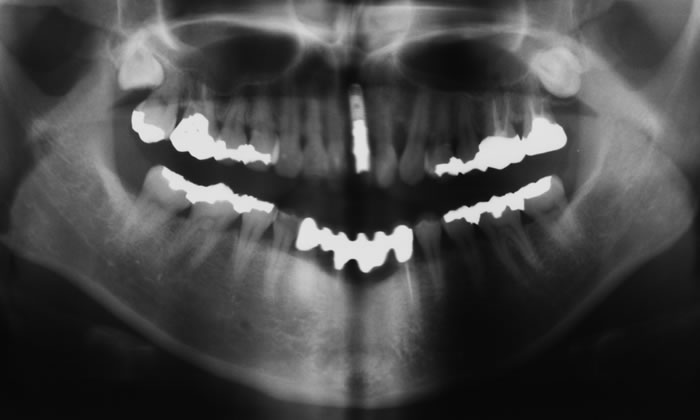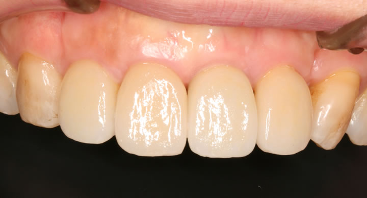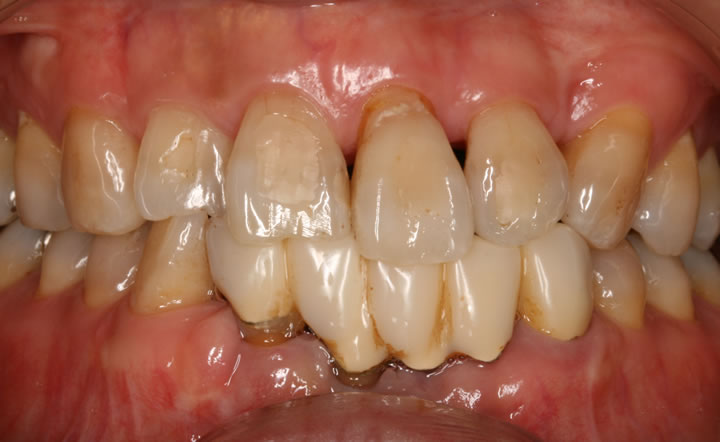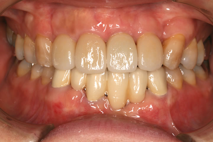 治療終了時の写真です。左上の前歯はインプラントになりました。 その他の前歯はラミネートべニアという治療方法できれいにしました。下の歯も陶器の歯でかぶせています。