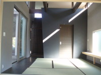 この住宅は、クライアントが日ごろの疲れを癒し、心身ともリラックスできるよう願い、描いてきた夢を実現する為に企画したものです。上田のリモデルさんに施工を依頼し、今年4月に着工を向かえ、10月に無事竣工いたしました。コストが厳しい中、施工にて工夫をし、協議しながら進めていける事に喜びを感じ、まさに手作り感のある現場でした。この家のテーマは「天空を眺める家」です。御代田町のカラマツ林に囲まれた自然のど真ん中に居ながらも、二つの中庭を囲むように配置した建物で、内なる場所で静寂に空を眺められる空間を意識してプランニングしております。きっとこの建物に来た人も落ち着ける、何か鳥の声とか、風の音とか、雲の流れとかゆっくりと過ごせられる場所で喜びを感じられればうれしく思っております。平屋建ての変わった間取りで「和」を意識した「男の隠れ家」のような家で、大工さんや各職人さんが納まりに大変苦労していました。そして、何よりこちらのご提案に対するお施主様のご理解のおかげで、すばらしい空間ができた事を感謝しております。