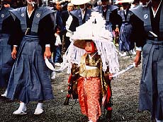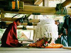 午前10時頃、本殿において「本殿の祭典」 「渡御の儀」が行われ、これが済むと拝殿神輿前で 宮司と三人の神子との間で「御幸の杯の儀」が 行われます。