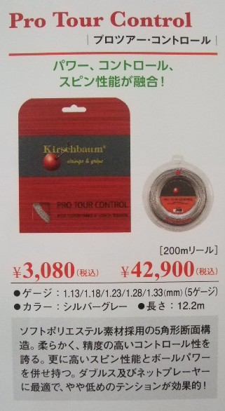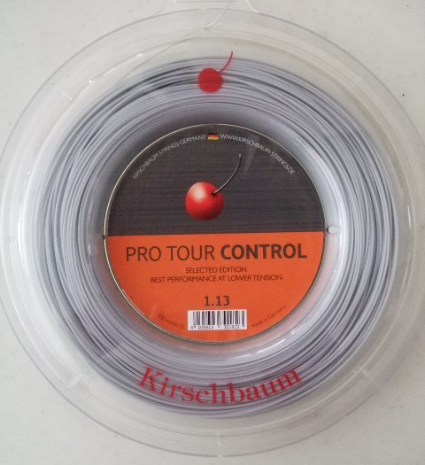 Kirschbaum(キルシュバウム) Pro Tour Control(プロツアーコントロール) 今回の"今日のストリング"はゲージ1.13mm のものになります。 もっとスピンをかけたいと思っている方や一度 ポリスとリングをと思っている方へ・・・。
